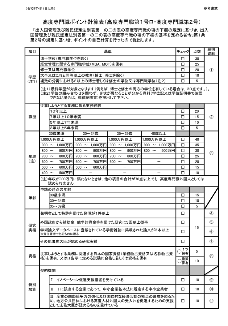 高度人材ポイントの計算方法(高度専門・技術活動の場合)